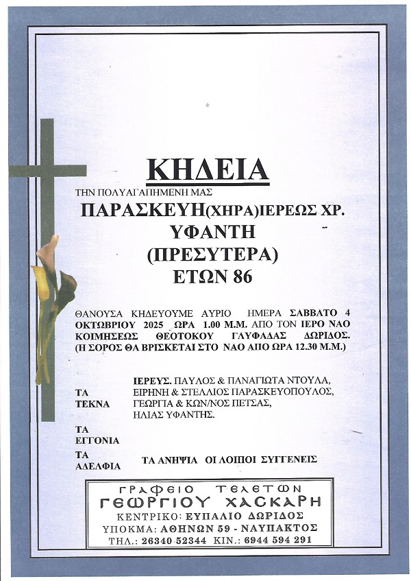 ΑρχικήΚΗΔΕΙΕΣΦωκίδαςΚΗΔΕΙΑ - ΣΑΒΒΑΤΟ 4/10/2025 - ΠΑΡΑΣΚΕΥΗ Χ. ΥΦΑΝΤΗ ΕΤΩΝ 86