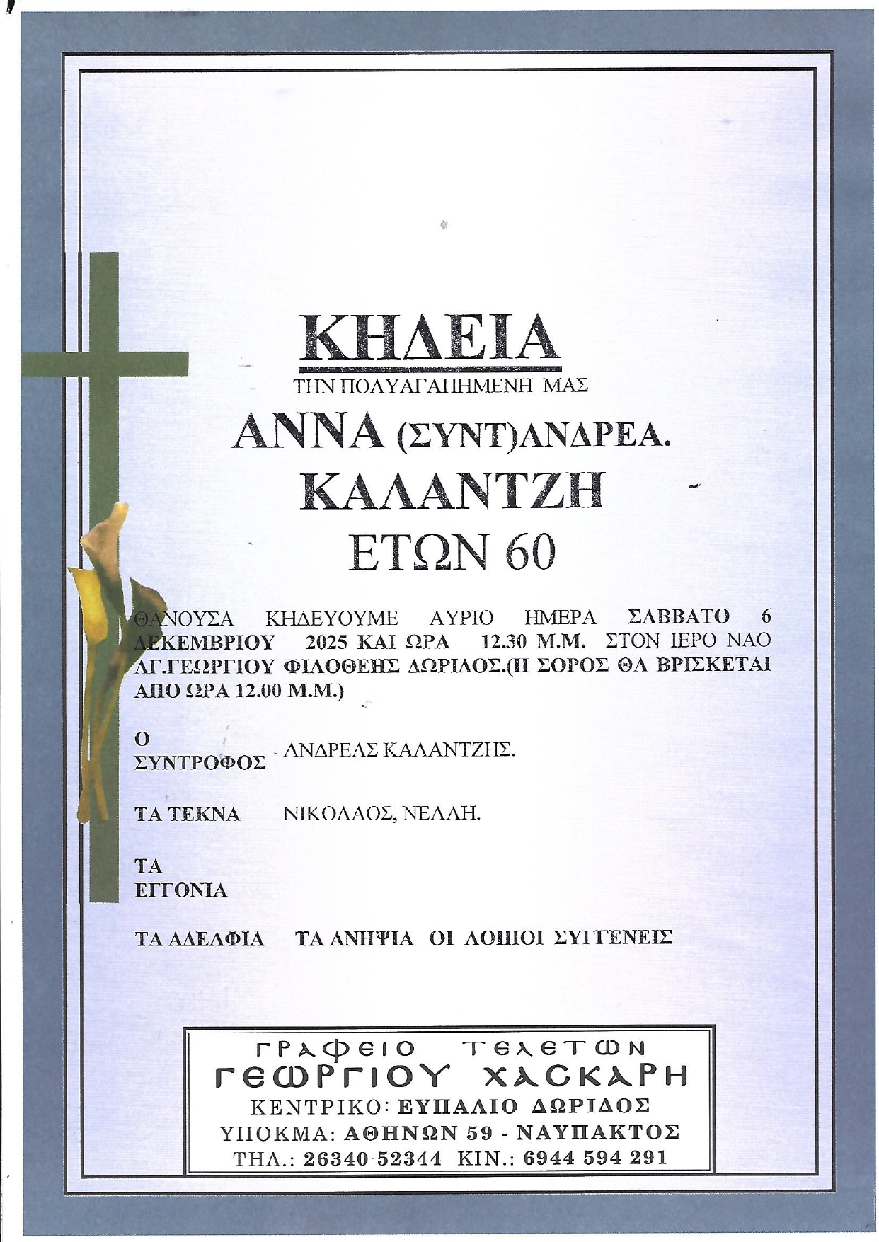 ΚΗΔΕΙΑ – ΣΑΒΒΑΤΟ 6/12/2025 – ΑΝΝΑ Α. ΚΑΛΑΝΤΖΗ ΕΤΩΝ 60