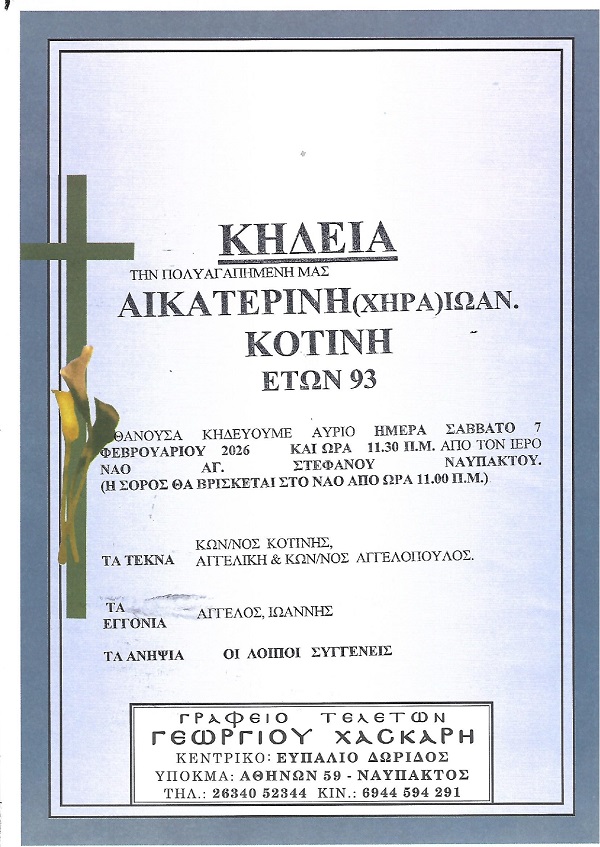 ΚΗΔΕΙΑ – ΣΑΒΒΑΤΟ 7/2/2026 – ΑΙΚΑΤΕΡΙΝΗ Ι. ΚΟΤΙΝΗ ΕΤΩΝ 93