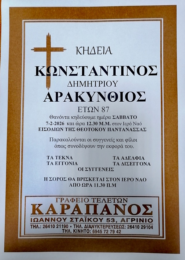 ΚΗΔΕΙΑ – ΣΑΒΒΑΤΟ 7/2/2026 – ΚΩΝΣΤΑΝΤΙΝΟΣ Δ. ΑΡΑΚΥΝΘΙΟΣ ΕΤΩΝ 87