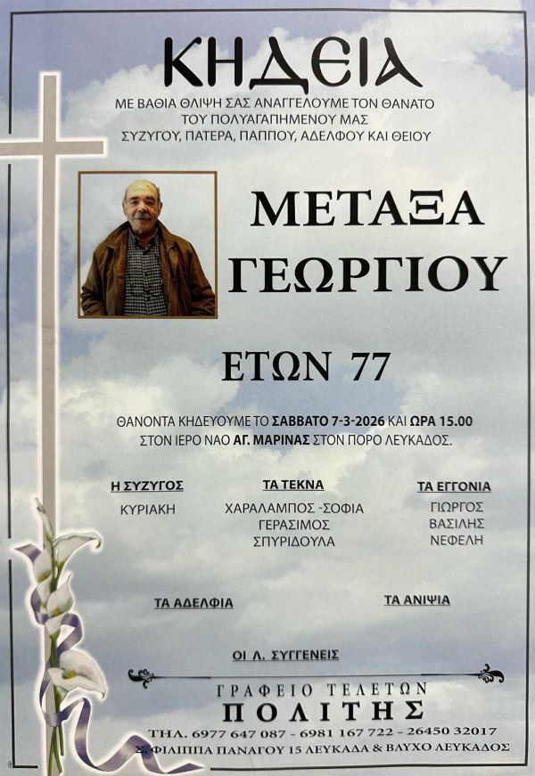 ΑρχικήΚΗΔΕΙΕΣΛευκάδαςΚΗΔΕΙΑ - ΣΑΒΒΑΤΟ 7/3/2026 - ΜΕΤΑΞΑ ΓΕΩΡΓΙΟΥ ΕΤΩΝ 77