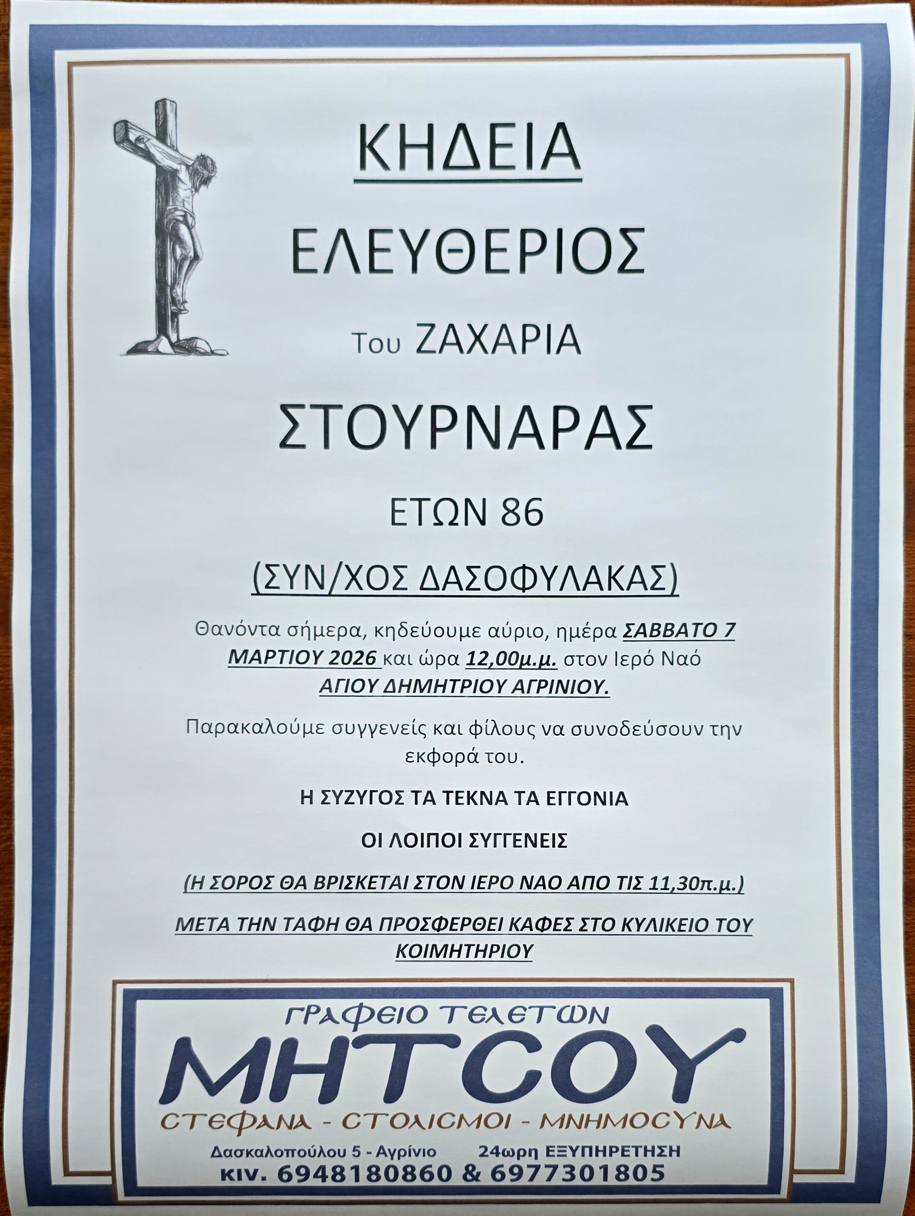 ΑρχικήΚΗΔΕΙΕΣAιτωλοακαρνανίαςΚΗΔΕΙΑ - ΣΑΒΒΑΤΟ 7/3/2026 - ΕΛΕΥΘΕΡΙΟΣ Ζ. ΣΤΟΥΡΝΑΡΑΣ ΕΤΩΝ 86