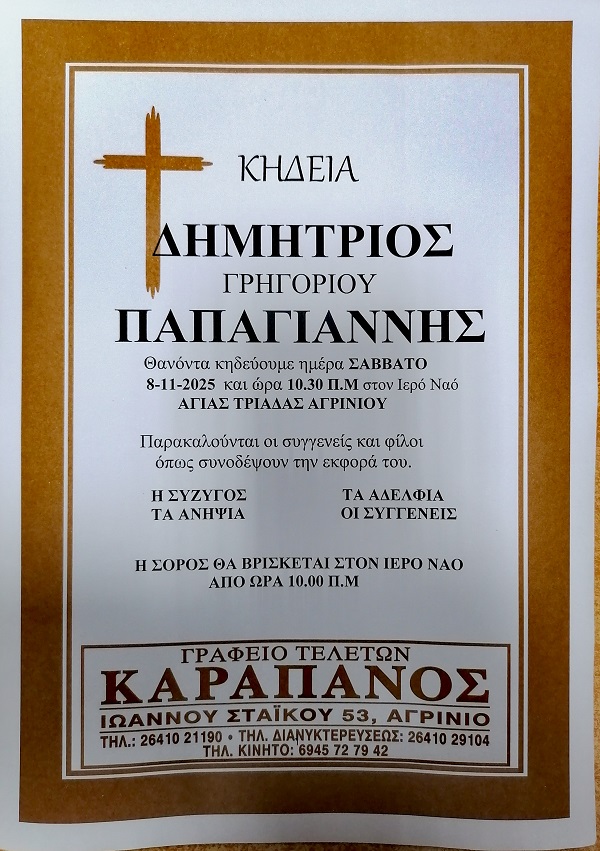 ΚΗΔΕΙΑ – ΣΑΒΒΑΤΟ 8/11/2025 – ΔΗΜΗΤΡΙΟΣ Γ. ΠΑΠΑΓΙΑΝΝΗΣ
