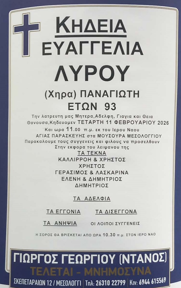 ΚΗΔΕΙΑ – ΤΕΤΑΡΤΗ 11/2/2026 – ΕΥΑΓΓΕΛΙΑ Π. ΛΥΡΟΥ ΕΤΩΝ 93