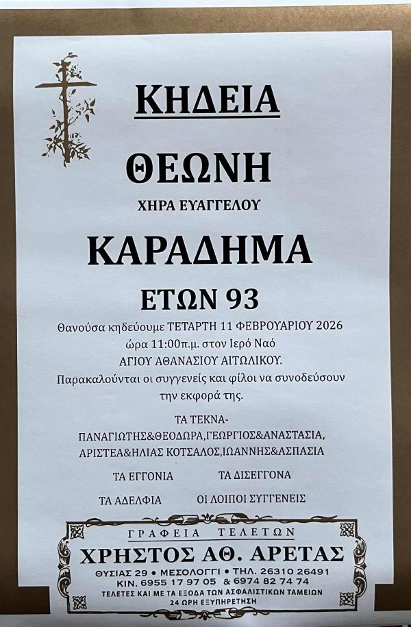 ΑρχικήΚΗΔΕΙΕΣAιτωλοακαρνανίαςΚΗΔΕΙΑ - ΤΕΤΑΡΤΗ 11/2/2026 - ΘΕΩΝΗ Ε. ΚΑΡΑΔΗΜΑ ΕΤΩΝ 93