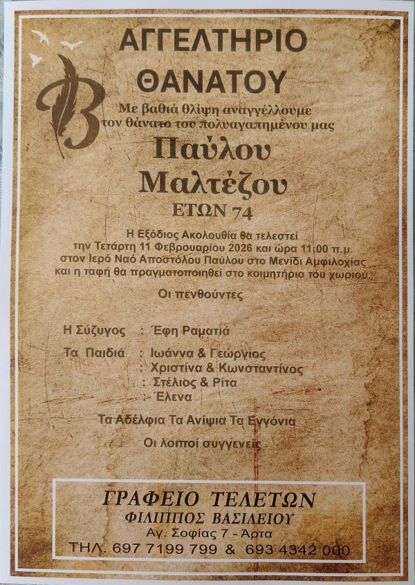 ΚΗΔΕΙΑ ΤΕΤΑΡΤΗ 11/2/2026 -ΠΑΥΛΟΣ ΜΑΛΤΕΖΟΣ ΕΤΩΝ 74