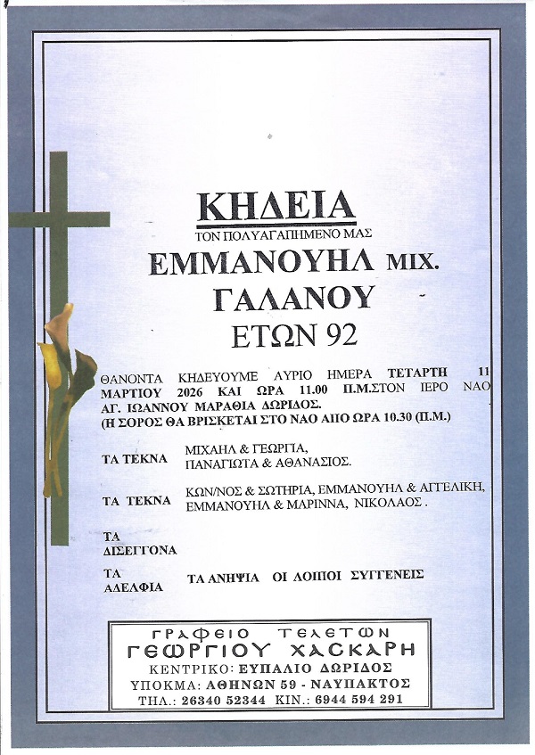 ΑρχικήΚΗΔΕΙΕΣΦωκίδαςΚΗΔΕΙΑ - ΤΕΤΑΡΤΗ 11/3/2026 - ΕΜΜΑΝΟΥΗΛ Μ. ΓΑΛΑΝΟΥ ΕΤΩΝ 92