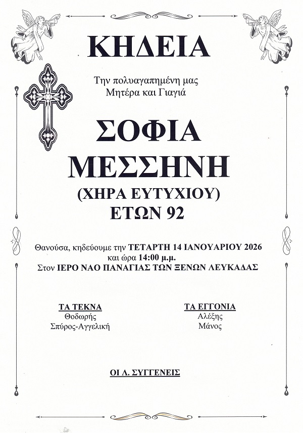 ΑρχικήΚΗΔΕΙΕΣΛευκάδαςΚΗΔΕΙΑ - ΤΕΤΑΡΤΗ 14/1/2026 - ΣΟΦΙΑ Ε. ΜΕΣΣΗΝΗ ΕΤΩΝ 92