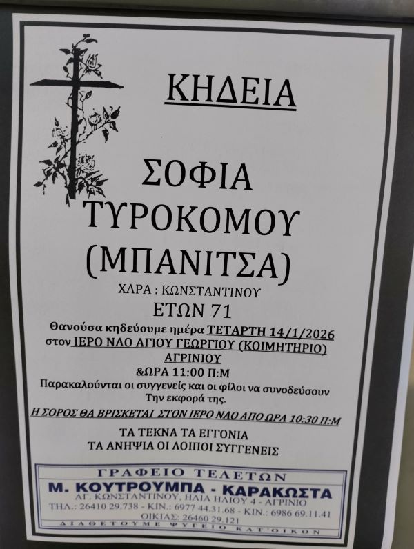 ΑρχικήΚΗΔΕΙΕΣAιτωλοακαρνανίαςΚΗΔΕΙΑ - ΤΕΤΑΡΤΗ 14/1/2026 - ΣΟΦΙΑ Κ. ΤΥΡΟΚΟΜΟΥ ΕΤΩΝ 71