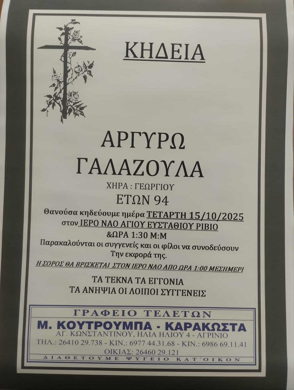 ΑρχικήΚΗΔΕΙΕΣAιτωλοακαρνανίαςΚΗΔΕΙΑ - ΤΕΤΑΡΤΗ 15/10/2025 - ΑΡΓΥΡΩ Γ. ΓΑΛΑΖΟΥΛΑ ΕΤΩΝ 94