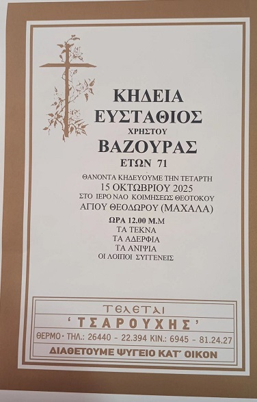 ΑρχικήΚΗΔΕΙΕΣAιτωλοακαρνανίαςΚΗΔΕΙΑ - ΤΕΤΑΡΤΗ 15/10/2025 - ΕΥΣΤΑΘΙΟΣ Χ. ΒΑΖΟΥΡΑΣ ΕΤΩΝ 71