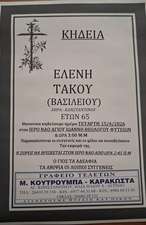 ΑρχικήΚΗΔΕΙΕΣAιτωλοακαρνανίαςΚΗΔΕΙΑ - ΤΕΤΑΡΤΗ 15/4/2026 - ΕΛΕΝΗ Κ. ΤΑΚΟΥ(ΒΑΣΙΛΕΙΟΥ) ΕΤΩΝ 65