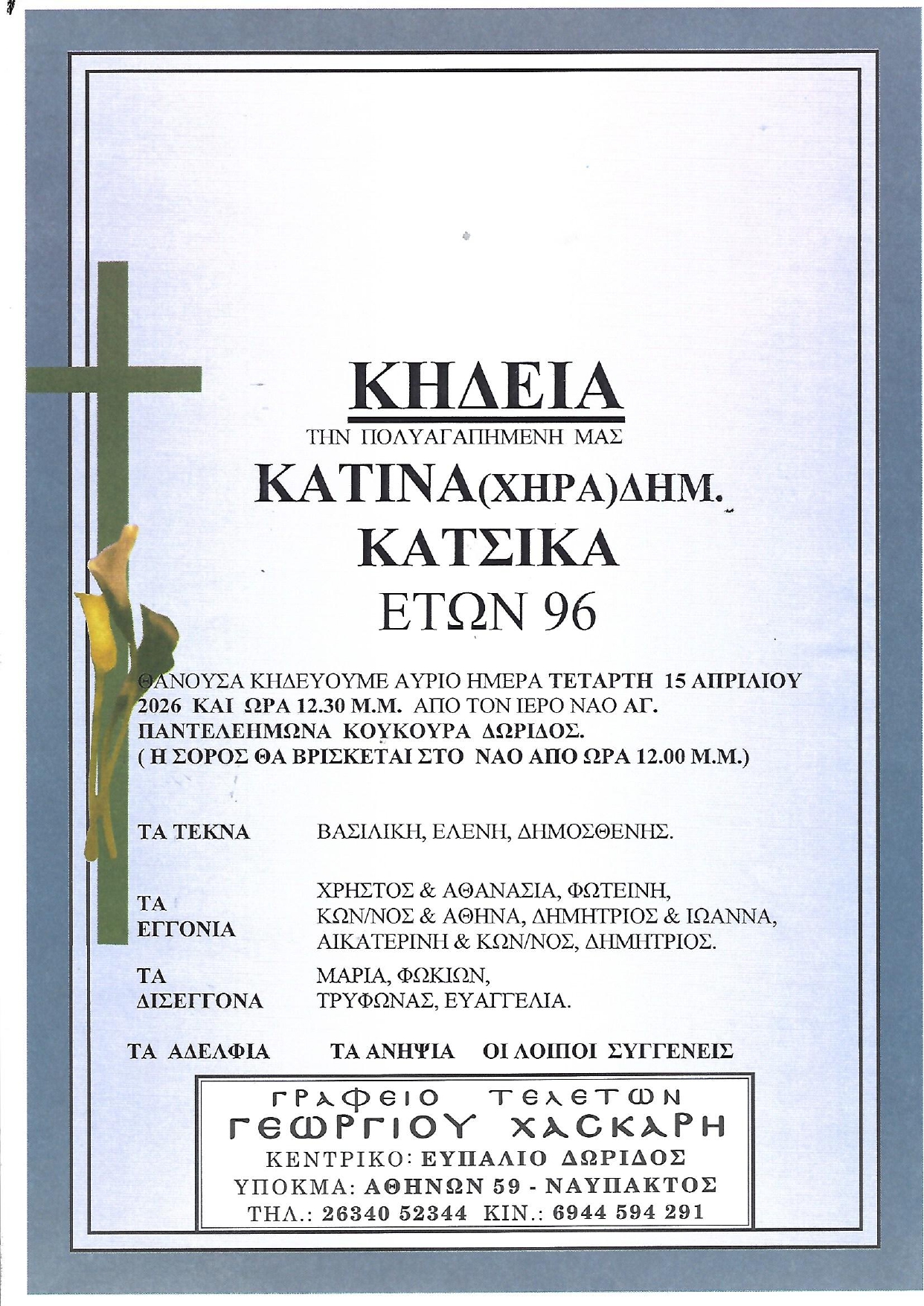 ΑρχικήΚΗΔΕΙΕΣΦωκίδαςΚΗΔΕΙΑ - ΤΕΤΑΡΤΗ 15/4/2026 - ΚΑΤΙΝΑ Δ. ΚΑΤΣΙΚΑ ΕΤΩΝ 96
