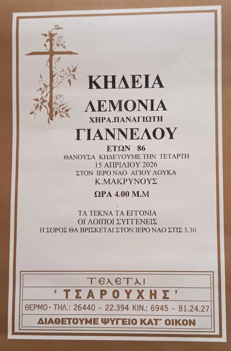 ΑρχικήΚΗΔΕΙΕΣAιτωλοακαρνανίαςΚΗΔΕΙΑ - ΤΕΤΑΡΤΗ 15/4/2026 - ΛΕΜΟΝΙΑ Π. ΓΙΑΝΝΕΛΟΥ ΕΤΩΝ 86