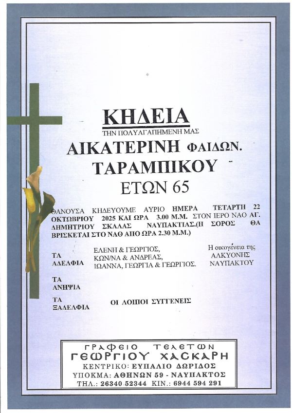 ΚΗΔΕΙΑ – ΤΕΤΑΡΤΗ 22/10/2025 – ΑΙΚΑΤΕΡΙΝΗ Φ. ΤΑΡΑΜΠΙΚΟΥ ΕΤΩΝ 65