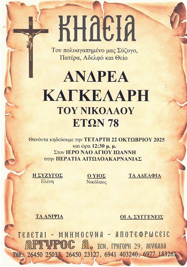 ΚΗΔΕΙΑ – ΤΕΤΑΡΤΗ 22/10/2025 – ΑΝΔΡΕΑΣ Ν. ΚΑΓΚΕΛΑΡΗΣ ΕΤΩΝ 78