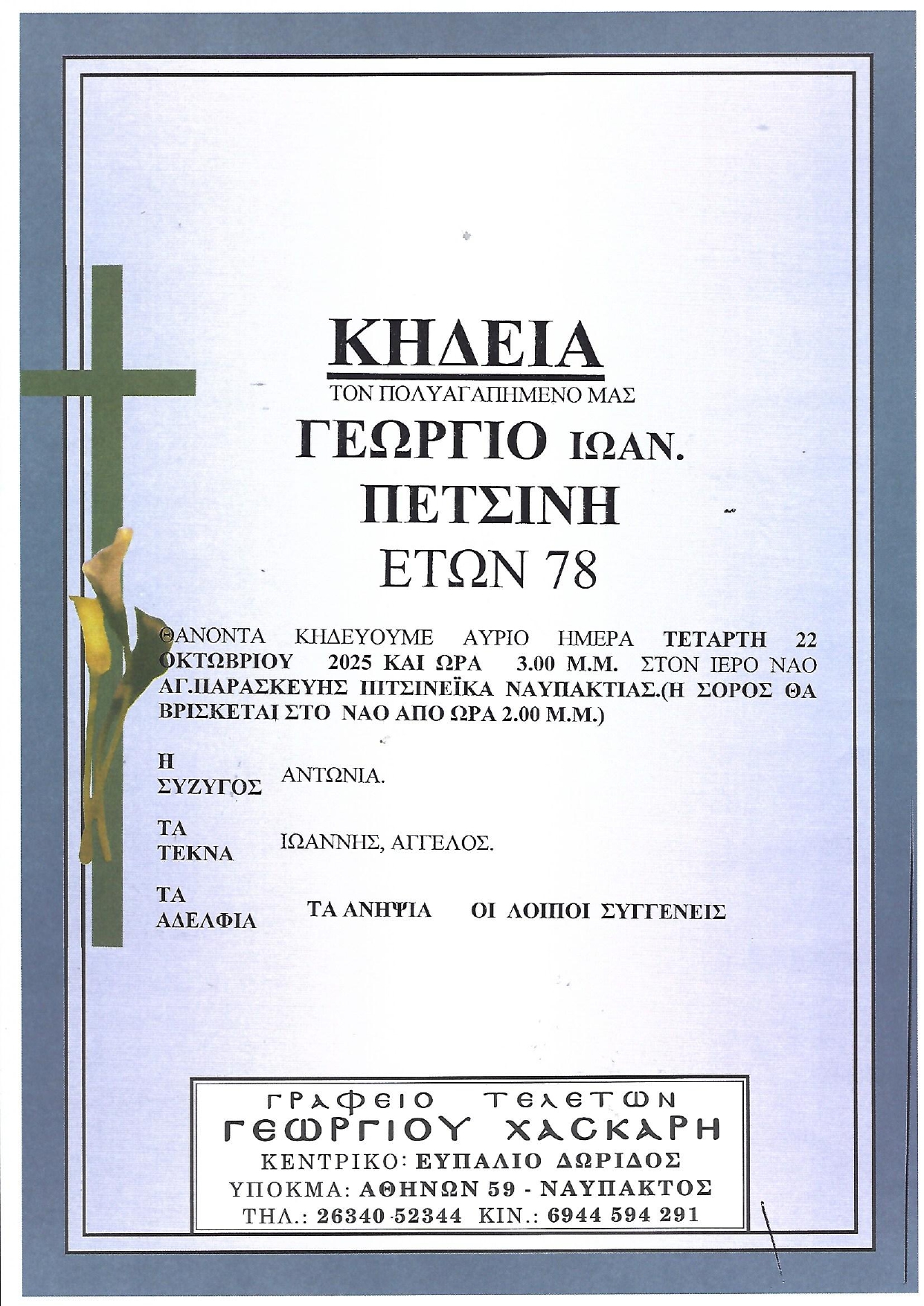 ΚΗΔΕΙΑ – ΤΕΤΑΡΤΗ 22/10/2025 – ΓΕΩΡΓΙΟΣ Ι. ΠΕΤΣΙΝΗΣ ΕΤΩΝ 78