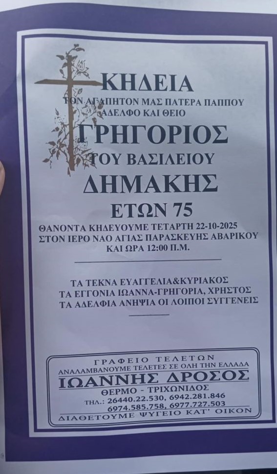 ΑρχικήΚΗΔΕΙΕΣAιτωλοακαρνανίαςΚΗΔΕΙΑ - ΤΕΤΑΡΤΗ 22/10/2025 - ΓΡΗΓΟΡΙΟΣ Β. ΔΗΜΑΚΗΣ ΕΤΩΝ 75