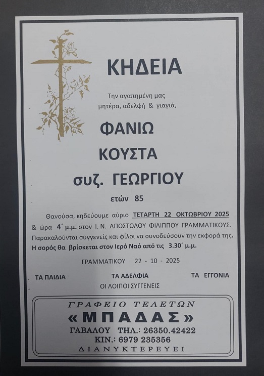 ΚΗΔΕΙΑ – ΤΕΤΑΡΤΗ 22/10/2025 – ΦΑΝΙΩ Γ. ΚΟΥΣΤΑ ΕΤΩΝ 85