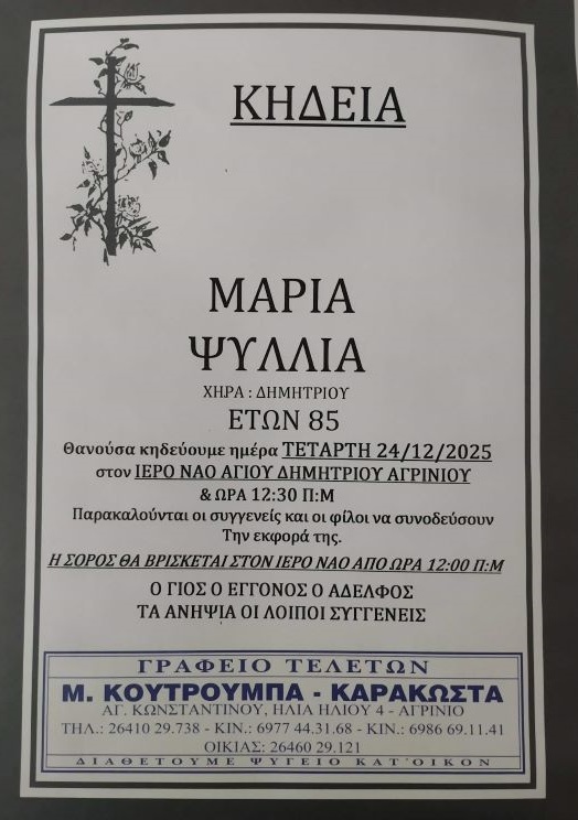 ΑρχικήΚΗΔΕΙΕΣAιτωλοακαρνανίαςΚΗΔΕΙΑ - ΤΕΤΑΡΤΗ 24/12/2025 - ΜΑΡΙΑ Δ. ΨΥΛΛΙΑ ΕΤΩΝ 85