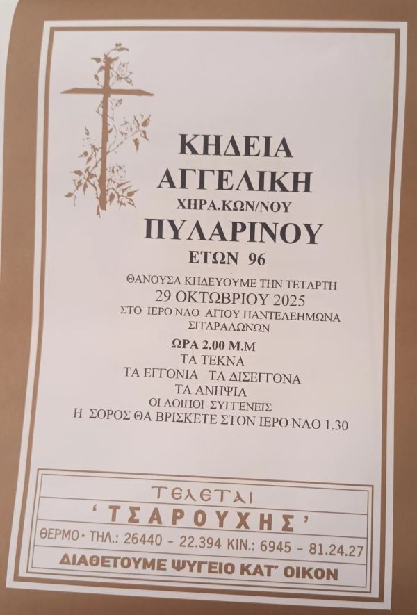 ΚΗΔΕΙΑ – ΤΕΤΑΡΤΗ 29/10/2025 – ΑΓΓΕΛΙΚΗ Κ. ΠΥΛΑΡΙΝΟΥ ΕΤΩΝ 96