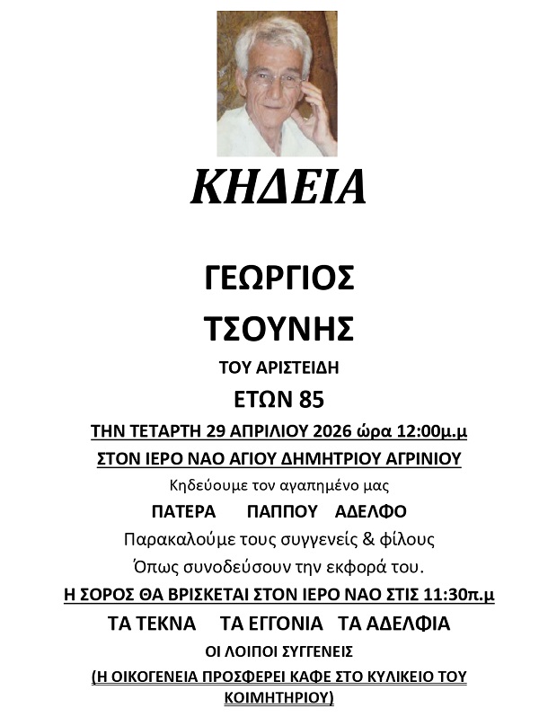 ΑρχικήΚΗΔΕΙΕΣAιτωλοακαρνανίαςΚΗΔΕΙΑ - ΤΕΤΑΡΤΗ 29/4/2026 - ΓΕΩΡΓΙΟΣ Α. ΤΣΟΥΝΗΣ ΕΤΩΝ 85