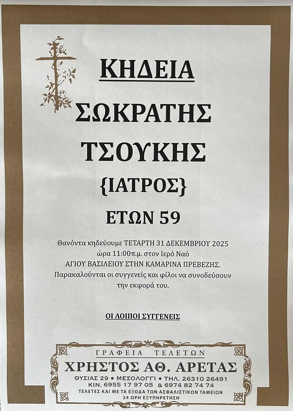 ΑρχικήΚΗΔΕΙΕΣΠρέβεζαςΚΗΔΕΙΑ - ΤΕΤΑΡΤΗ 31/12/2025 - ΣΩΚΡΑΤΗΣ ΤΣΟΥΚΗΣ (ΙΑΤΡΟΣ) ΕΤΩΝ 59