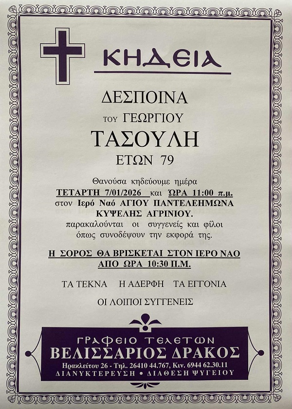 ΑρχικήΚΗΔΕΙΕΣAιτωλοακαρνανίαςΚΗΔΕΙΑ - ΤΕΤΑΡΤΗ 7/1/2026 - ΔΕΣΠΟΙΝΑ Γ. ΤΑΣΟΥΛΗ ΕΤΩΝ 79