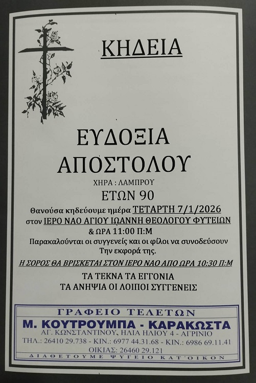 ΑρχικήΚΗΔΕΙΕΣAιτωλοακαρνανίαςΚΗΔΕΙΑ - ΤΕΤΑΡΤΗ 7/1/2026 - ΕΥΔΟΞΙΑ Λ. ΑΠΟΣΤΟΛΟΥ ΕΤΩΝ 90