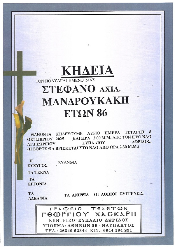 ΑρχικήΚΗΔΕΙΕΣΦωκίδαςΚΗΔΕΙΑ - ΤΕΤΑΡΤΗ 8/10/2025 - ΣΤΕΦΑΝΟΣ Α. ΜΑΝΔΡΟΥΚΑΚΗΣ ΕΤΩΝ 86