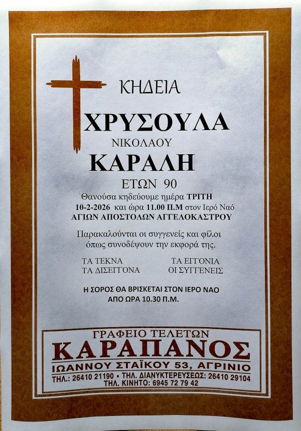 ΑρχικήΚΗΔΕΙΕΣAιτωλοακαρνανίαςΚΗΔΕΙΑ - ΤΡΙΤΗ 10/2/2026 - ΧΡΥΣΟΥΛΑ Ν. ΚΑΡΑΛΗ ΕΤΩΝ 90