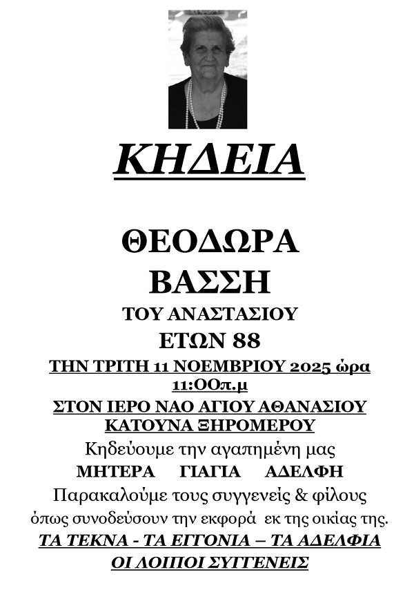 ΚΗΔΕΙΑ – ΤΡΙΤΗ 11/11/2025 – ΘΕΟΔΩΡΑ Α. ΒΑΣΣΗ ΕΤΩΝ 88