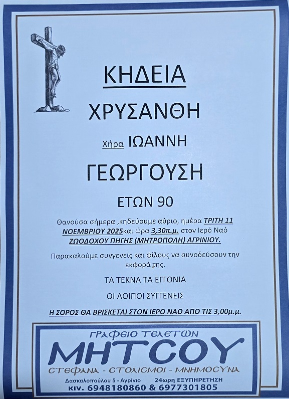 ΑρχικήΚΗΔΕΙΕΣAιτωλοακαρνανίαςΚΗΔΕΙΑ - ΤΡΙΤΗ 11/11/2025 - ΧΡΥΣΑΝΘΗ Ι. ΓΕΩΡΓΟΥΣΗ ΕΤΩΝ 90