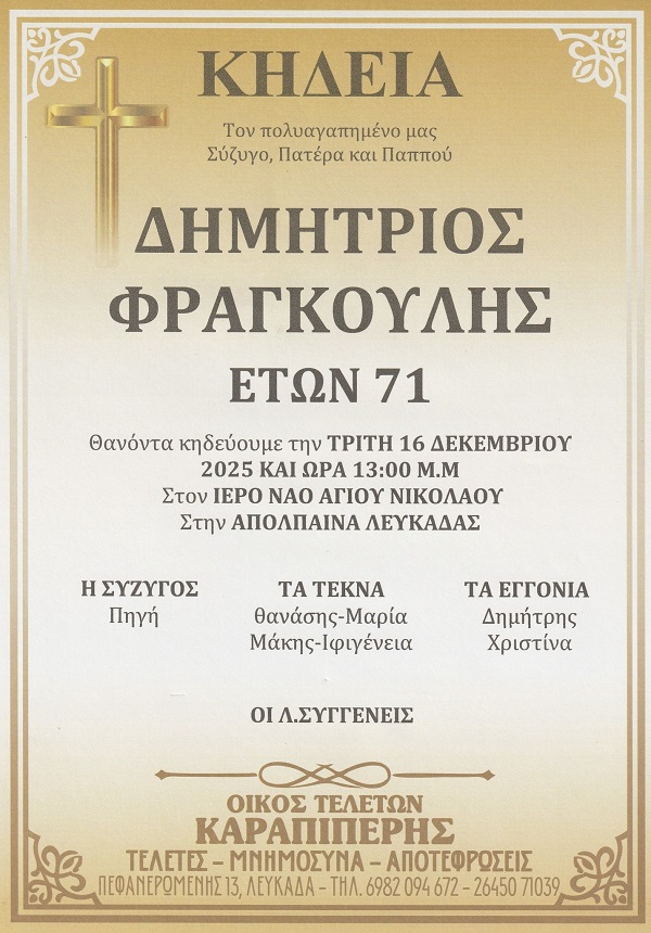 ΑρχικήΚΗΔΕΙΕΣΛευκάδαςΚΗΔΕΙΑ - ΤΡΙΤΗ 16/12/2025 - ΔΗΜΗΤΡΙΟΣ ΦΡΑΓΚΟΥΛΗΣ ΕΤΩΝ 71