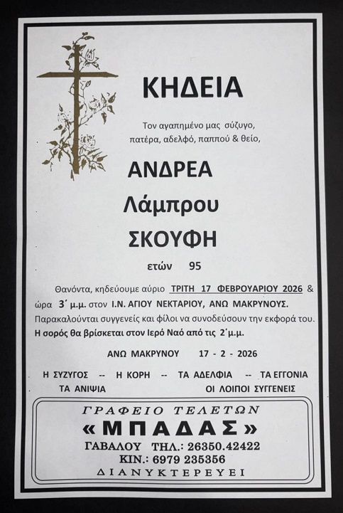 ΚΗΔΕΙΑ – ΤΡΙΤΗ 17/2/2026 – ΑΝΔΡΕΑΣ Λ. ΣΚΟΥΦΗΣ ΕΤΩΝ 95