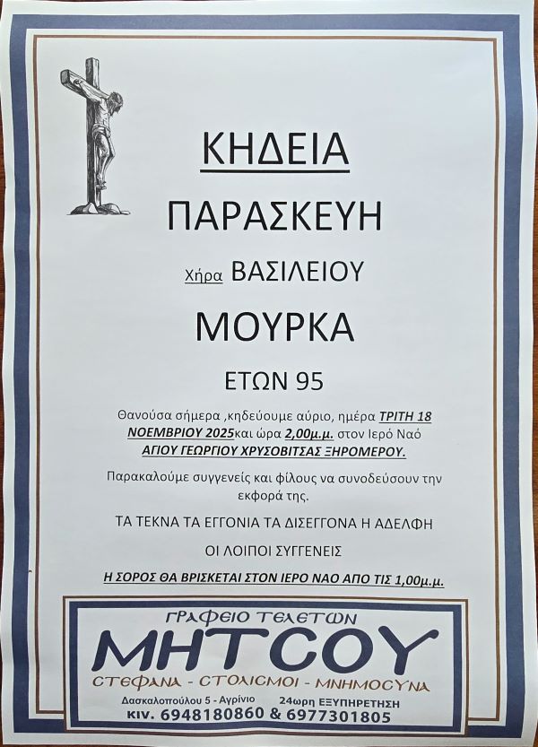 ΑρχικήΚΗΔΕΙΕΣAιτωλοακαρνανίαςΚΗΔΕΙΑ - ΤΡΙΤΗ 18/11/2025 - ΠΑΡΑΣΚΕΥΗ Β. ΜΟΥΡΚΑ ΕΤΩΝ 95