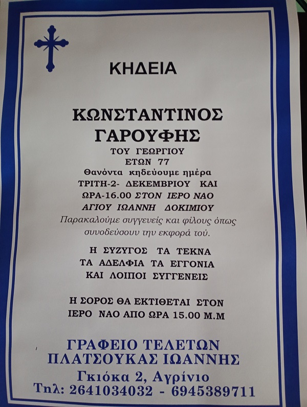 ΚΗΔΕΙΑ – ΤΡΙΤΗ 2/12/2025 – ΚΩΝΣΤΑΝΤΙΝΟΣ Γ. ΓΑΡΟΥΦΗΣ ΕΤΩΝ 77