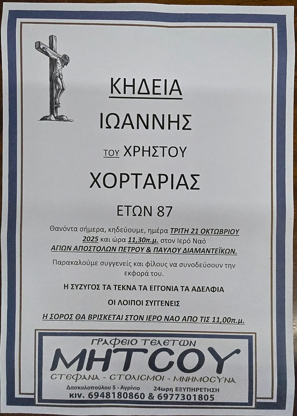 ΑρχικήΚΗΔΕΙΕΣAιτωλοακαρνανίαςΚΗΔΕΙΑ - ΤΡΙΤΗ 21/10/2025 - ΙΩΑΝΝΗΣ Χ. ΧΟΡΤΑΡΙΑΣ ΕΤΩΝ 87