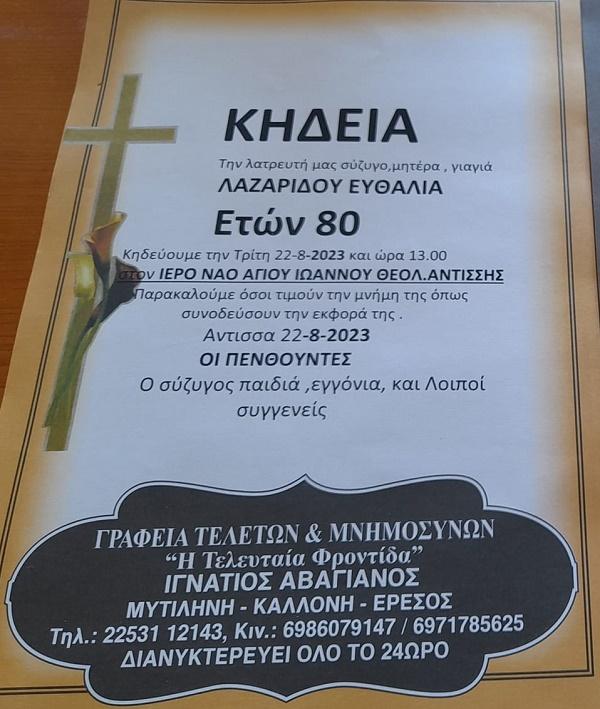 ΚΗΔΕΙΑ – ΤΡΙΤΗ 22/8/2023 – ΕΥΘΑΛΙΑ ΛΑΖΑΡΙΔΟΥ ΕΤΩΝ 80