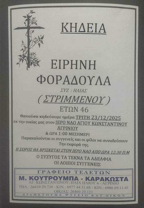ΚΗΔΕΙΑ – ΤΡΙΤΗ 23/12/2025 – ΕΙΡΗΝΗ Η. ΦΟΡΑΔΟΥΛΑ-ΣΤΡΙΜΜΕΝΟΥ ΕΤΩΝ 46