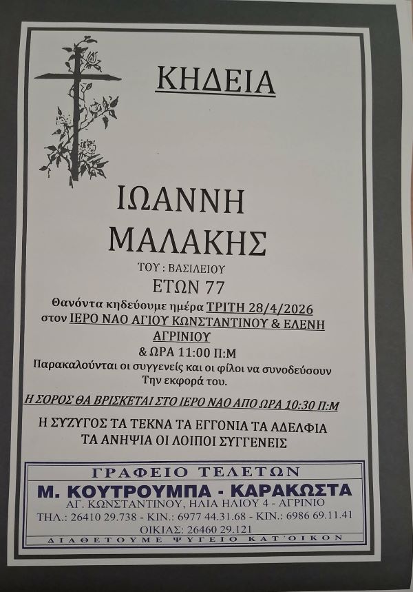 ΑρχικήΚΗΔΕΙΕΣAιτωλοακαρνανίαςΚΗΔΕΙΑ - ΤΡΙΤΗ 28/4/2026 - ΙΩΑΝΝΗΣ Β. ΜΑΛΑΚΗΣ ΕΤΩΝ 77