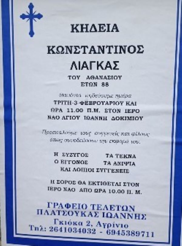 ΚΗΔΕΙΑ – ΤΡΙΤΗ 3/2/2026 – ΚΩΝΣΤΑΝΤΙΝΟΣ Α. ΛΙΑΓΚΑΣ ΕΤΩΝ 88