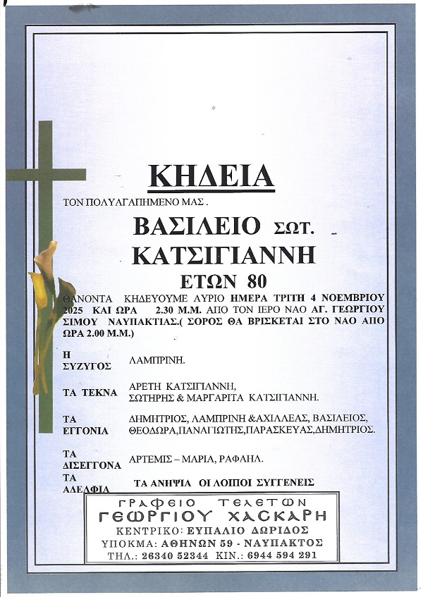 ΑρχικήΚΗΔΕΙΕΣAιτωλοακαρνανίαςΚΗΔΕΙΑ - ΤΡΙΤΗ 4/11/2025 - ΒΑΣΙΛΕΙΟΣ Σ. ΚΑΤΣΙΓΙΑΝΝΗΣ ΕΤΩΝ 80