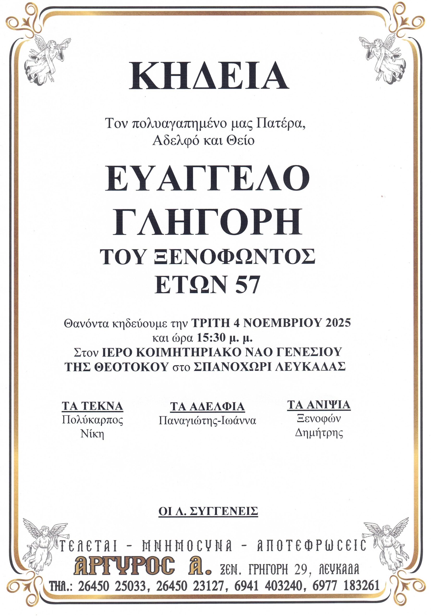 ΚΗΔΕΙΑ – ΤΡΙΤΗ 4/11/2025 – ΕΥΑΓΓΕΛΟΣ Ξ. ΓΛΗΓΟΡΗΣ ΕΤΩΝ 57
