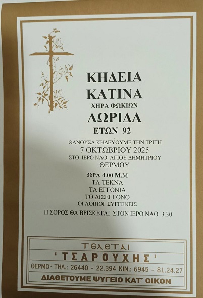 ΚΗΔΕΙΑ – ΤΡΙΤΗ 7/10/2025 – ΚΑΤΙΝΑ Φ. ΛΩΡΙΔΑ ΕΤΩΝ 92
