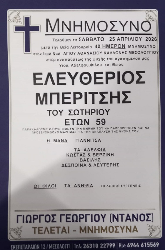 ΑρχικήΜΝΗΜΟΣΥΝΑΑιτωλοακαρνανίαςΜΝΗΜΟΣΥΝΟ ΣΑΒΒΑΤΟ 25/4/2026 - ΕΛΕΥΘΕΡΙΟΣ Σ. ΜΠΕΡΙΤΣΗΣ 40ΗΜΕΡΟ