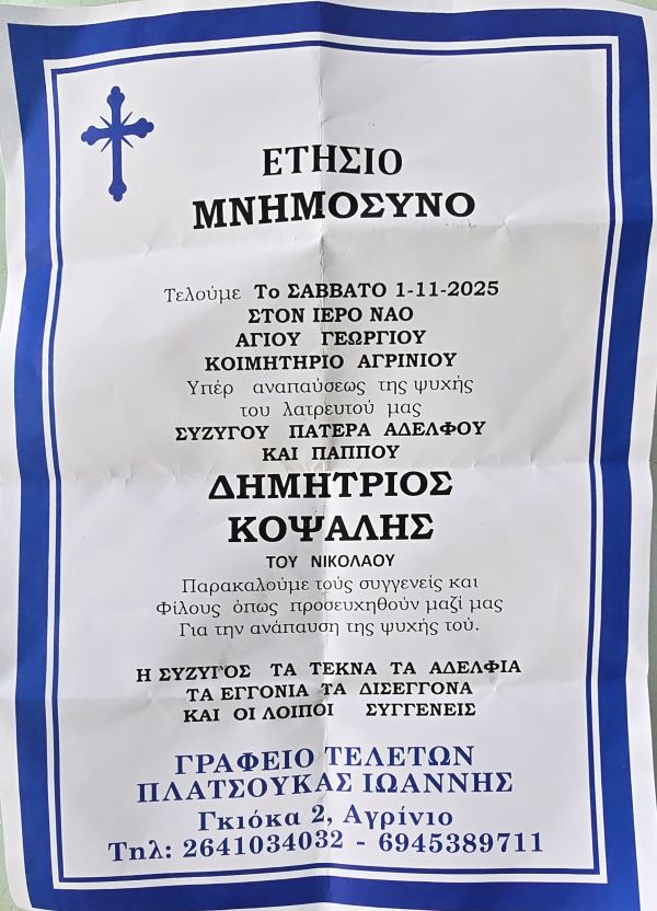 ΜΝΗΜΟΣΥΝΟ 1/11/2025 – ΔΗΜΗΤΡΙΟΣ Ν. ΚΟΨΑΛΗΣ ΕΤΗΣΙΟ