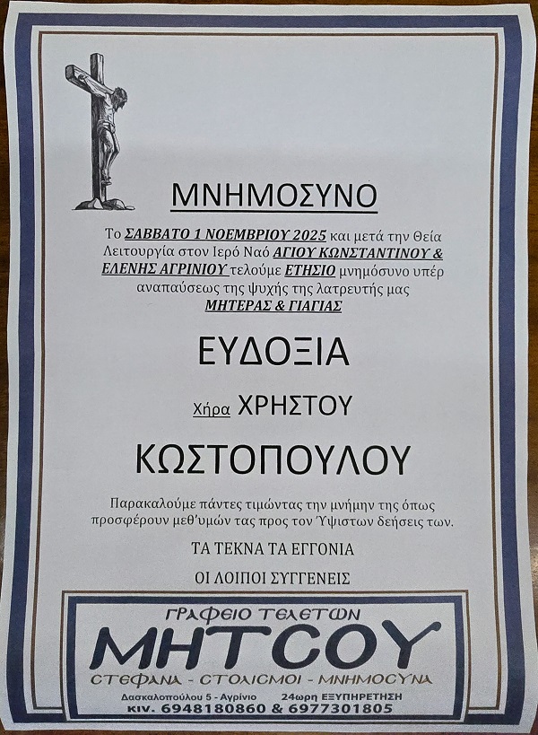 ΜΝΗΜΟΣΥΝΟ 1/11/2025 – ΕΥΔΟΞΙΑ Χ. ΚΩΣΤΟΠΟΥΛΟΥ ΕΤΗΣΙΟ