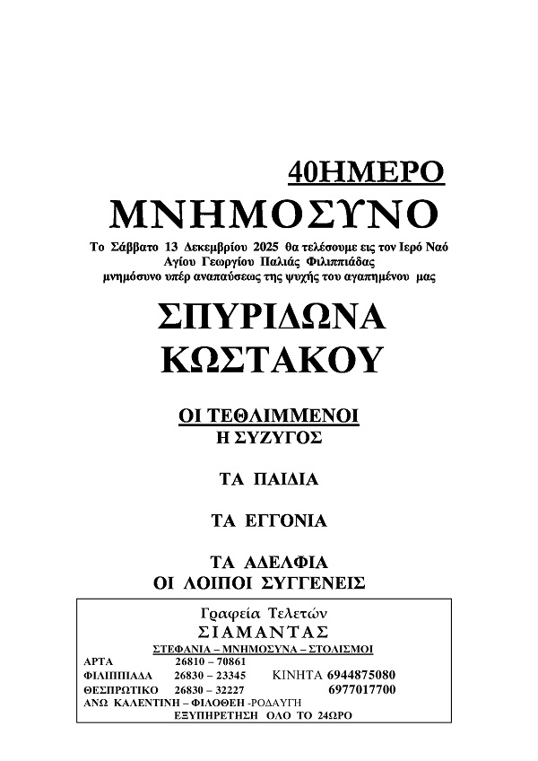 ΑρχικήΜΝΗΜΟΣΥΝΑΠρέβεζαςΜΝΗΜΟΣΥΝΟ 13/12/2025 - ΣΠΥΡΙΔΩΝ ΚΩΣΤΑΚΟΣ 40ΗΜΕΡΟ