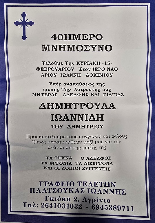 ΜΝΗΜΟΣΥΝΟ 15/2/2026 – ΔΗΜΗΤΡΟΥΛΑ Δ. ΙΩΑΝΝΙΔΗ 40ΗΜΕΡΟ